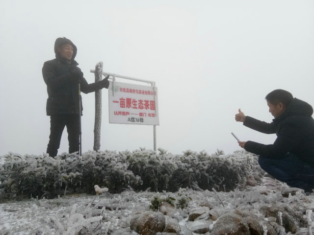 2018年的第一场雪突然而至,芙蓉山系银装素裹,松涛阵阵,烧香尖傲立群峰,一篇冰世界。烧香尖茶业公司董事长李辉顶飞雪,穿林海,走冰峰,守护生态茶园。